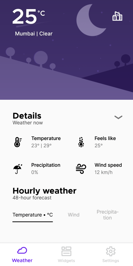 The main app screen is simply glorious with a simple, minimal design. It does not have any fancy or overblown effects like many other weather apps have; it carries a clean but pleasing design. It shows all the necessary information you need such as temperature, humidity, forecast, wind levels and so on. The top of the screen is accompanied by a cool graphic as background, depending on what theme you choose.