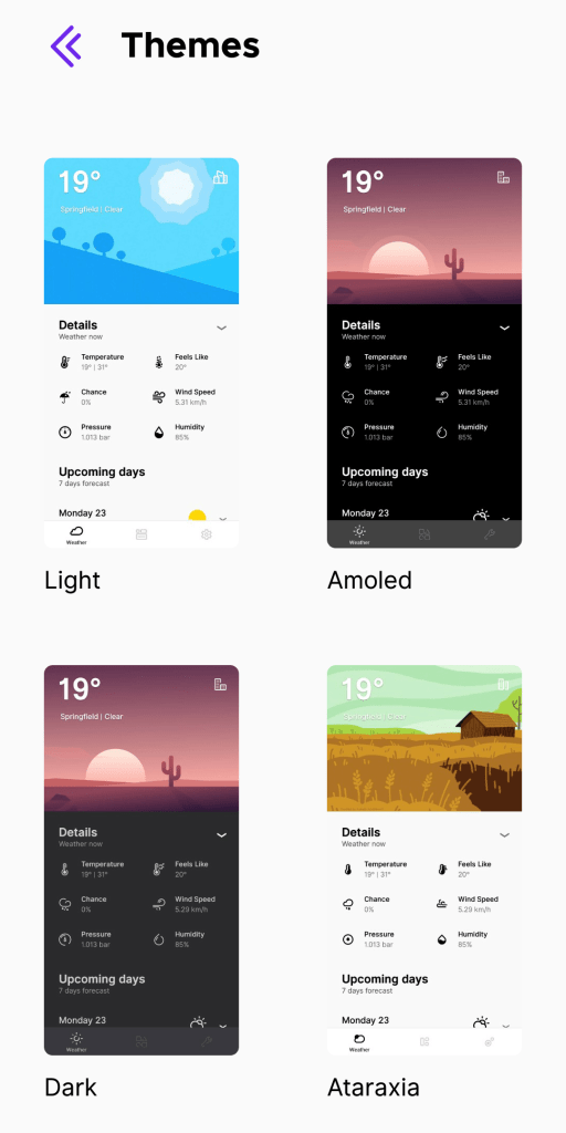 Now theme in a weather app is mostly unheard of. Such apps usually offer a variety on widgets, but very few offer theming of the actual app interface. Overdrop Weather however, provides 5 different theme options for the main interface, complete with light, dark and colorful outlays. There is even an pitch black theme for amoled screens, however it is only for those who buy the pro version. Still, 3 themes for free version is not bad at all!