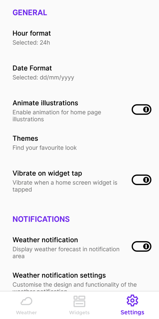 Overdrop Weather for Android comes with all the standard settings and options to allow users to change between temperature units, add more cities, customization of notifications and many more. Most of the settings are not locked behind the pro version, allowing full flexibility for users to try the app before buying the pro version.
